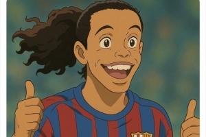 罗纳尔迪尼奥社媒晒出效力巴萨时期照片AI生成的漫画图片,并配上呲牙笑和标志性庆祝手势的符号。