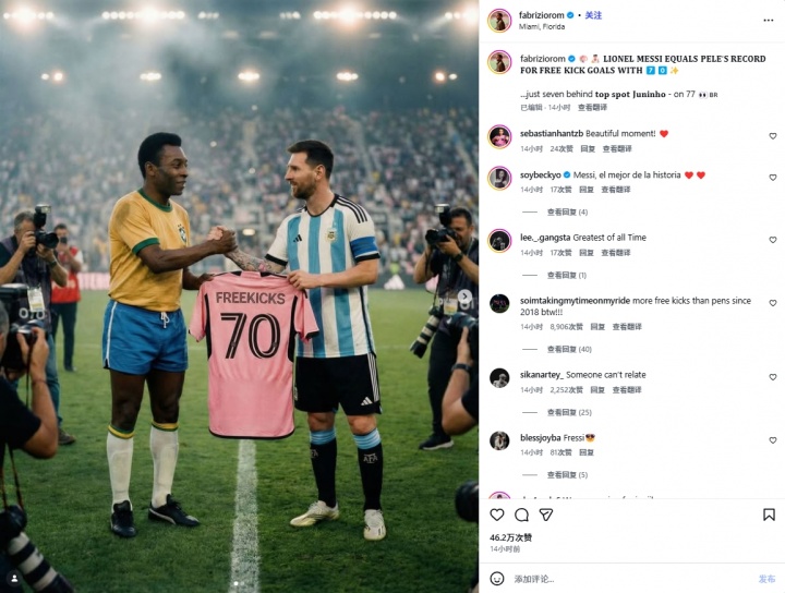 名记罗马诺晒出P图同时写道:“梅西追平贝利任意球纪录,达到70球!距离榜首的儒尼尼奥只差7球。”