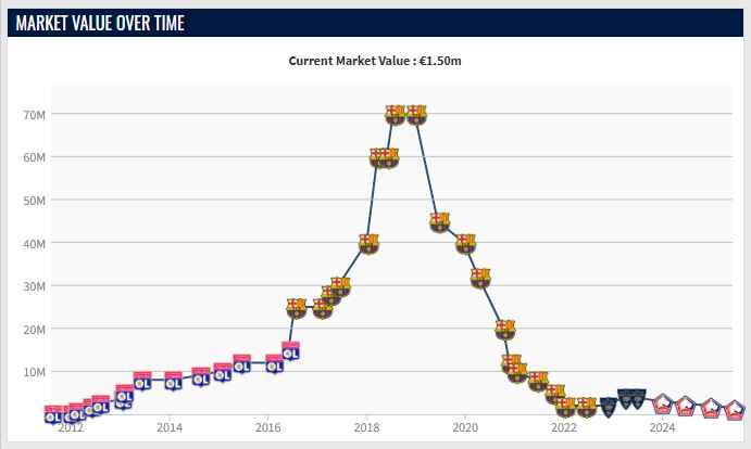 这位昔日身价峰值达7000万欧元的顶级后卫,目前市场估值已暴跌至150万欧元。